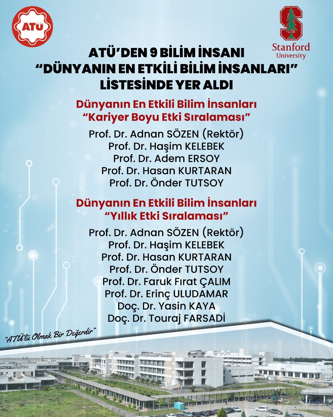 ATÜ Rektörü Prof. Dr. Adnan SÖZEN’in de aralarında bulunduğu akademisyenler, “Kariyer Boyu Etki” ve “Yıllık Etki” olmak üzere iki ayrı kategoride değerlendirildi. Bu başarı, ATÜ’nün sadece bir eğitim kurumu olmakla kalmayıp, aynı zamanda küresel ölçekte bilim üreten bir merkez haline geldiğinin en net kanıtı oldu.