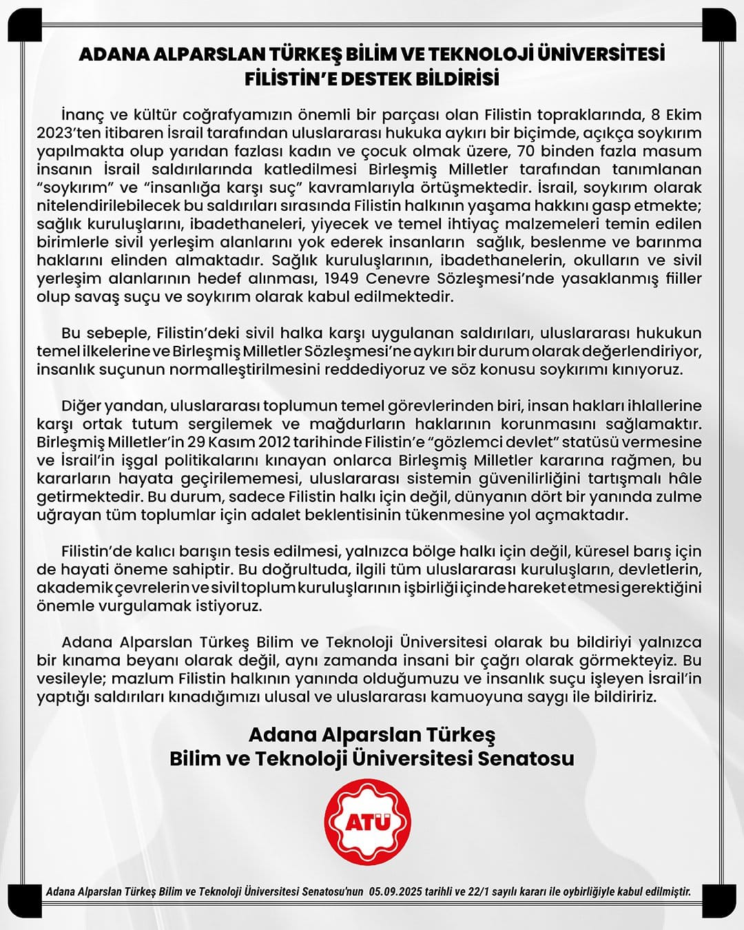 Adana’nın önde gelen eğitim kurumlarından Alparslan Türkeş Bilim ve Teknoloji Üniversitesi (ATÜ) Senatosu, Filistin’de yaşanan insanlık dramına sessiz kalmadı. Üniversite tarafından oybirliğiyle kabul edilen ve kamuoyuna duyurulan bildiride, İsrail’in 8 Ekim 2023’ten bu yana devam eden saldırıları en sert dille kınandı.