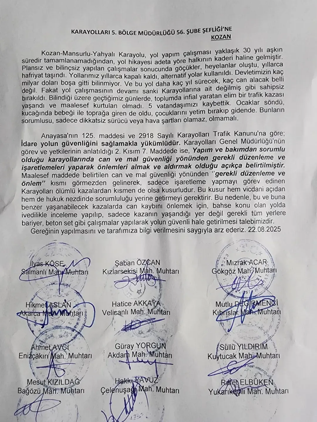 Kozan ilçesine bağlı 12 mahalle muhtarı, yapımı yaklaşık 30 yıldır tamamlanamayan Kozan-Mansurlu-Yahyalı Karayolu ile ilgili ortak bir dilekçe yayımladı. Dilekçenin, yol üzerinde yakın zamanda meydana gelen ve beş vatandaşın hayatını kaybettiği trafik kazasının ardından hazırlandığı öğrenildi.
