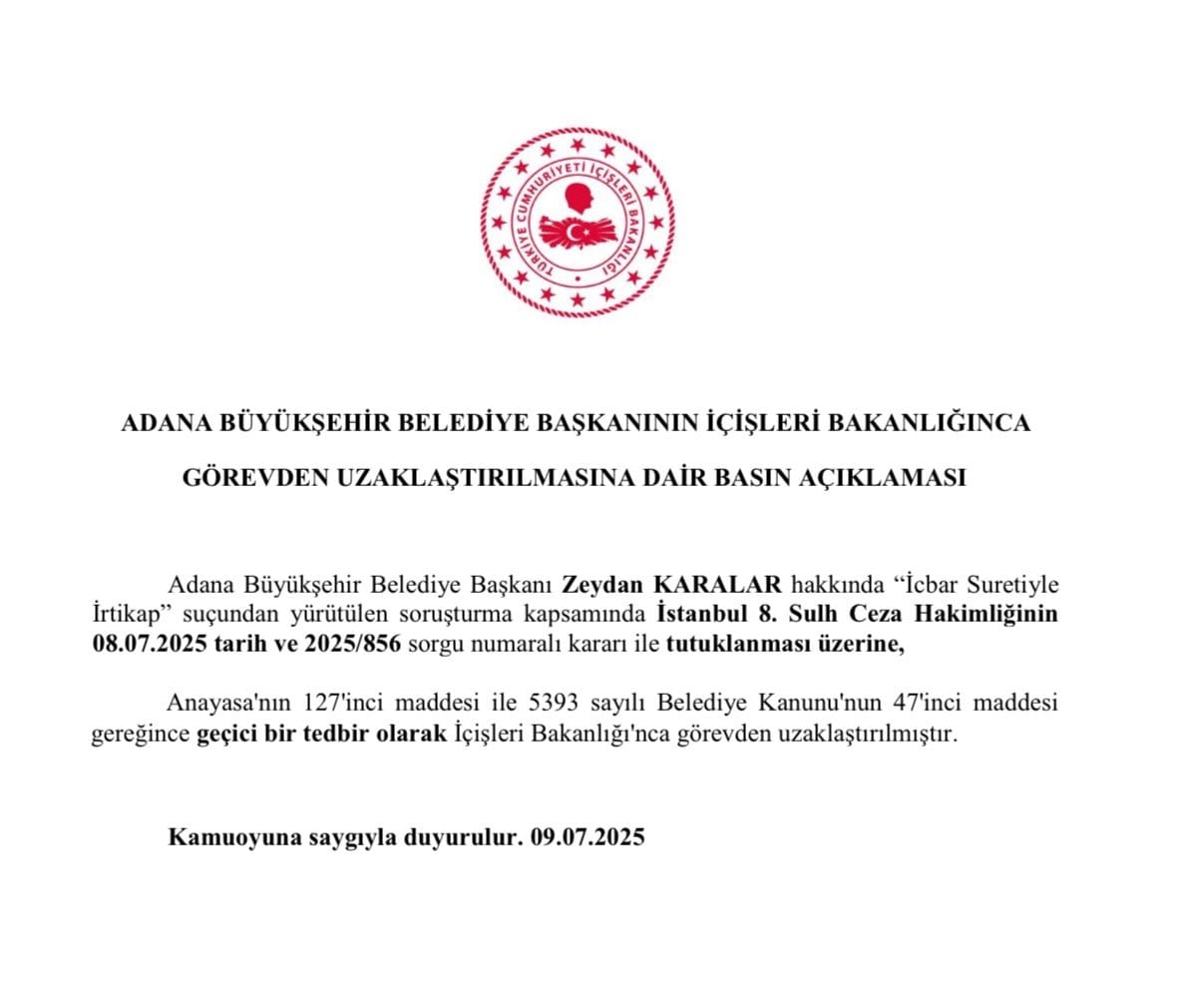 Adana Büyükşehir Belediye Başkanı Zeydan Karalar, hakkında yürütülen bir soruşturma kapsamında görevinden geçici olarak uzaklaştırıldı. İçişleri Bakanlığı, Karalar’ın “İcbar suretiyle irtikap” suçlamasıyla başlatılan adli süreç sonucunda tutuklandığını ve Anayasa ile Belediye Kanunu hükümleri çerçevesinde görevinden alındığını kamuoyuna duyurdu.