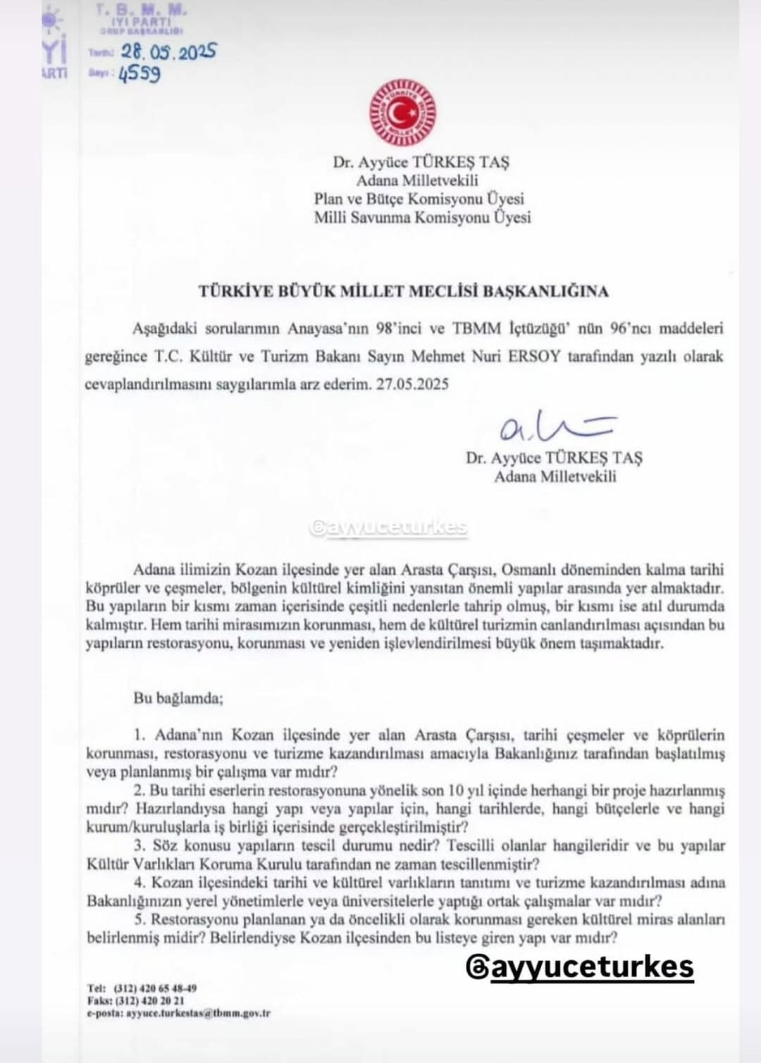 Kozan’ın zengin tarihi ve kültürel mirasının korunması ve geleceğe taşınması adına önemli bir adım atıldı. Adana Milletvekili ve aynı zamanda Plan ve Bütçe Komisyonu ile Milli Savunma Komisyonu Üyesi olan Dr. Ayyüce Türkeş Taş, Kozan ilçesinin sembol yapılarından olan tarihi Arasta Çarşısı, Osmanlı döneminden kalma tarihi köprüler ve çeşmelerin durumunu Türkiye Büyük Millet Meclisi (TBMM) gündemine taşıdı.