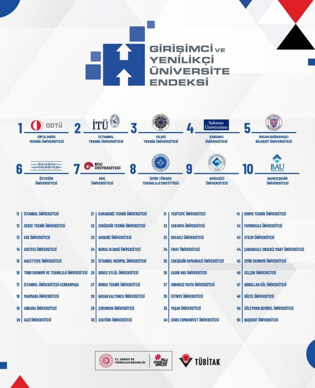 Türkiye Bilimsel ve Teknolojik Araştırma Kurumu (TÜBİTAK) tarafından açıklanan Girişimci ve Yenilikçi Üniversite Endeksi’nde Çukurova Üniversitesi, 208 üniversite arasında 29. sıraya yerleşerek dikkat çekici bir başarı elde etti. Üniversite, bu endekste sergilediği yükselen ivmeyle girişimcilik ve yenilikçilik alanındaki kararlılığını bir kez daha ortaya koydu.